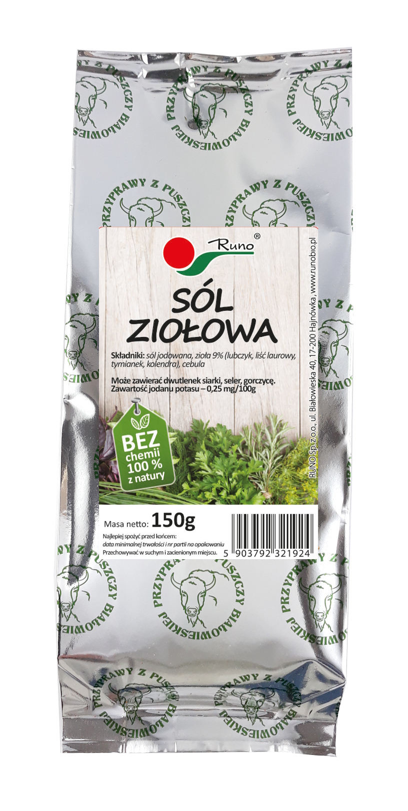 sól jodowana, zioła 9% (lubczyk, liść laurowy, tymianek, kolendra), cebula.