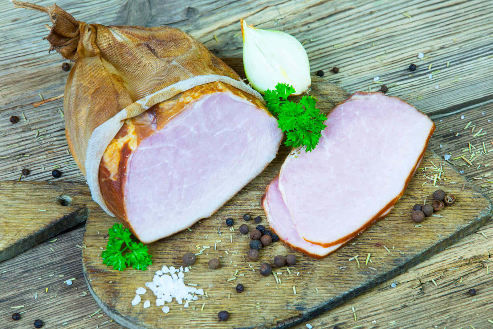 Ręcznie formowana jasno wędzona szynka, z odrobiną tłuszczu. Dzięki tradycyjnej Podlaskiej recepturze, opartej na wyszukanej mieszance przypraw zadowoli każdego, kto ceni tradycyjny smak i aromat.